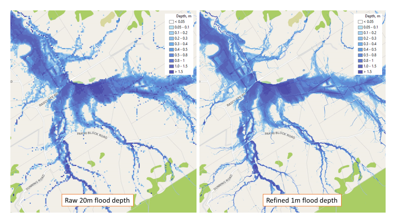 2. Model result refinement technology. 20m raw model outputs can be exported to GIS to be further processed with 1m Lidar 2016, the refined 1m model result will give more details of the flood risk and clearer flood extent boundary.